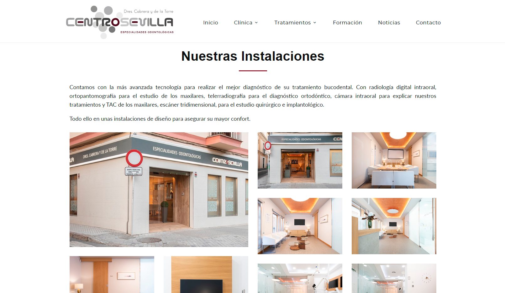 La página web de Clínica Centro Sevilla incluye toda la información de interés de la clínica, así como los servicios y tratamientos ofrecidos en ella e incluso una zona exclusiva para presentar a los miembros que conforman el equipo. También se puede solicitar cita online gracias a su formulario de contacto, visualizar cada rincón de la sus instalaciones gracias a la galería y conocer con más detalle su distribución en el video corporativo donde se muestran todas las salas: recepción, consultas, despacho, sala de espera…